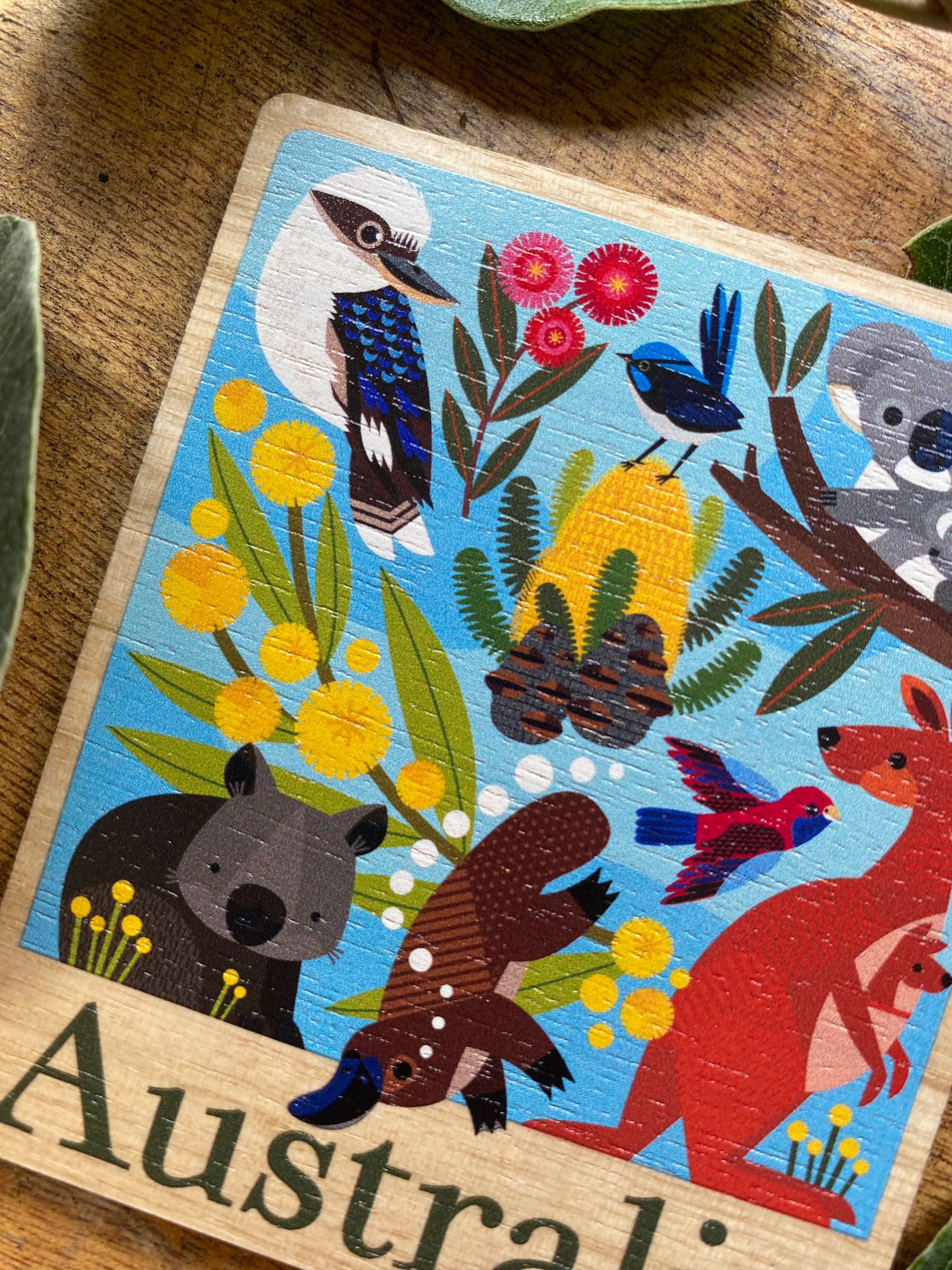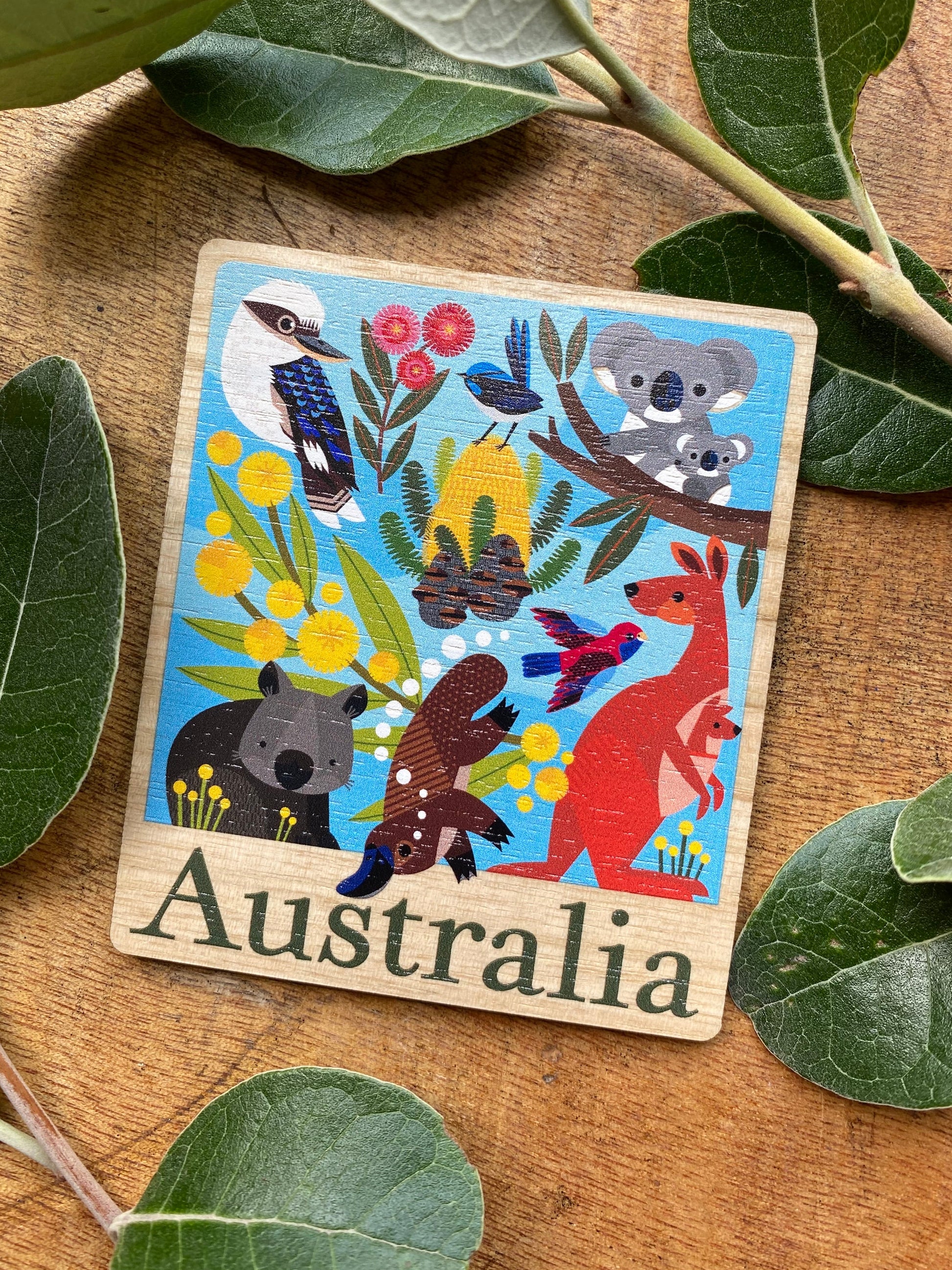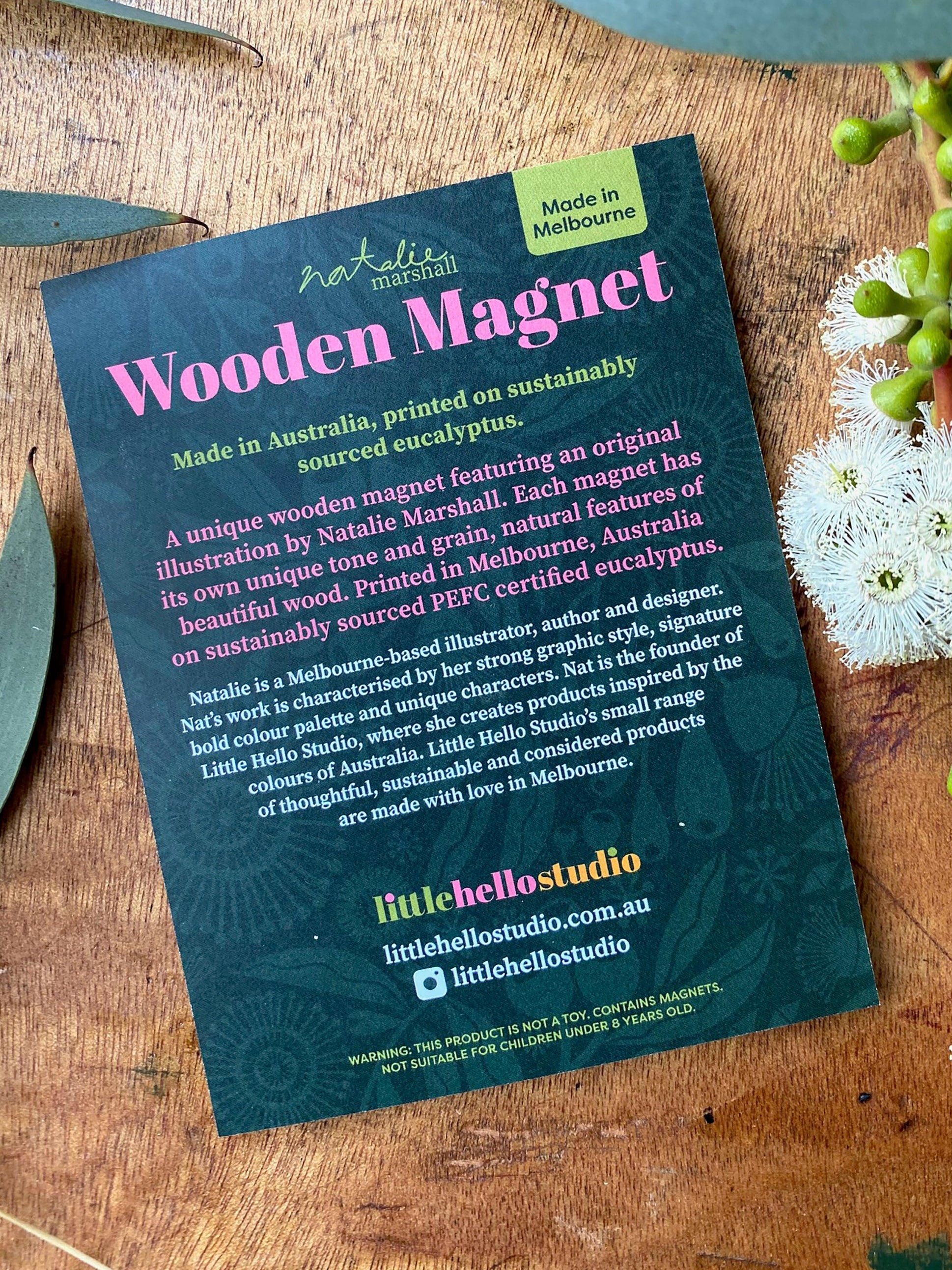 A celebration of iconic Australian flora and fauna, this colourful and handy magnet will appeal to both locals and visitors. Featuring my illustrations of a kookaburra, wombat, red kangaroo, koala and platypus and more, this magnet is 70mm wide x 83mm high. My wooden magnets are designed and printed in Melbourne on sustainably sourced PEFC-certified eucalyptus and assembled by hand in my Melbourne studio.